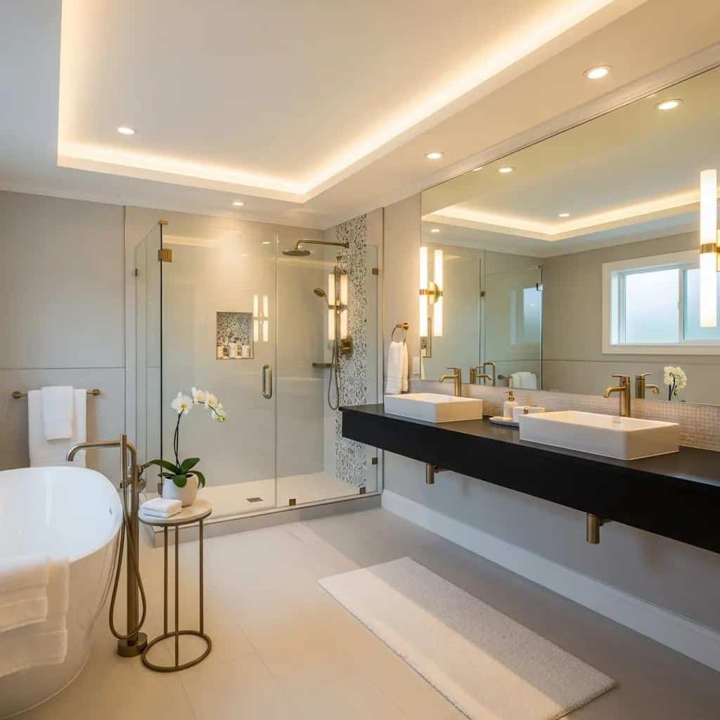 Luxurious bathroom renovation featuring modern fixtures, spacious layout, double sinks, walk-in shower, and elegant design elements, emphasizing aesthetic appeal and functionality for Langley homeowners.
