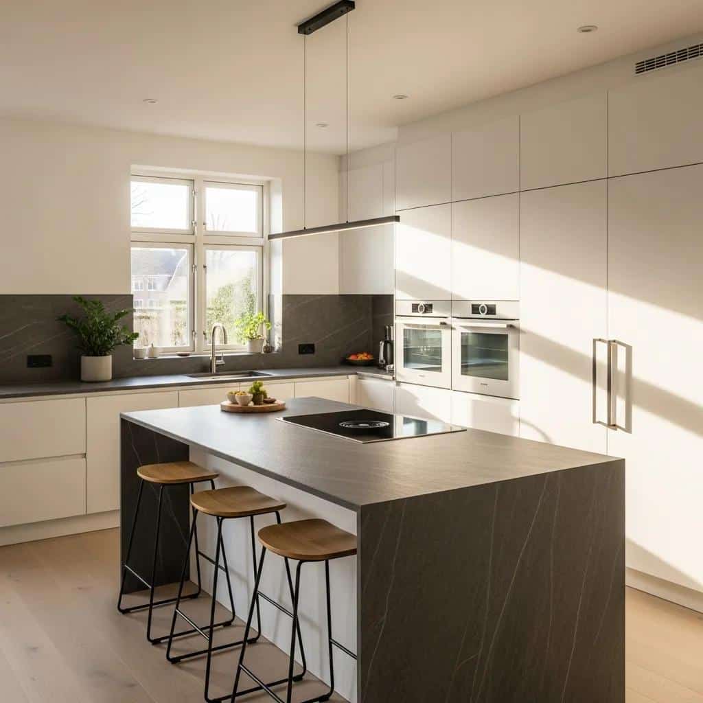 Modern kitchen with sleek design, updated appliances, and a central island featuring bar stools, showcasing a functional and stylish space ideal for renovations to enhance home value in Langley.